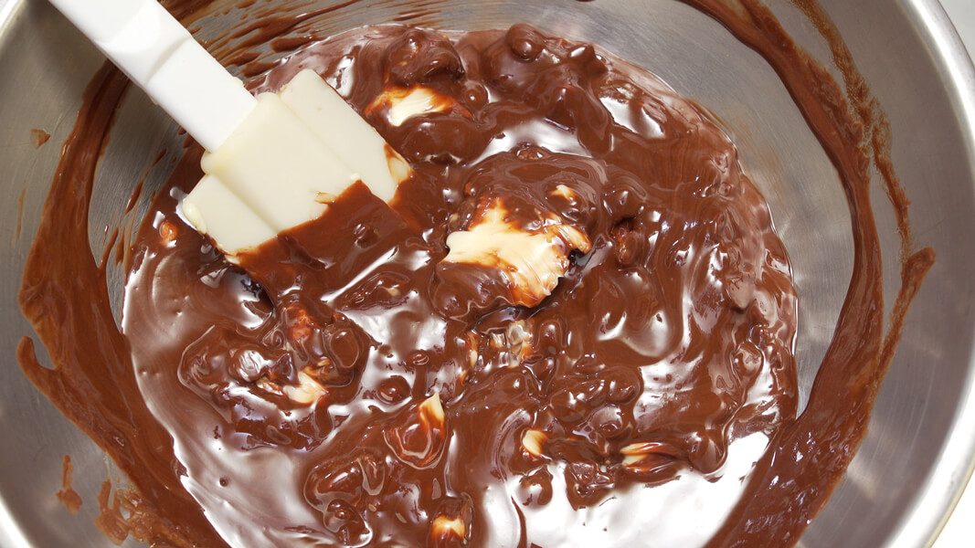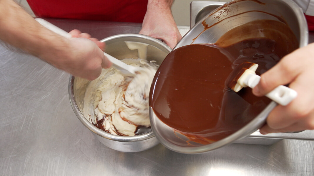 Incorporez le mélange beurre chocolat, jusqu’à obtenir une pâte bien homogène.